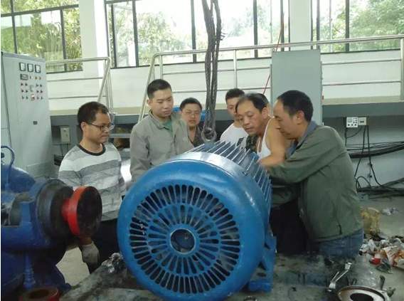 (圖為技術(shù)人員正在維護保養(yǎng)中壓泵房3#供水機組)