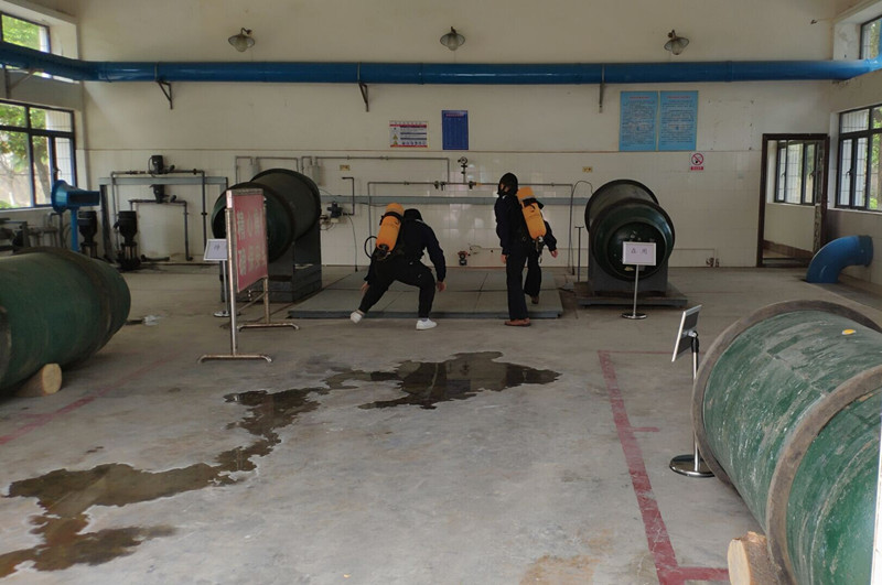 演練開始前,三水廠負責人對全廠職工進行了防火滅火知識培訓(xùn),并安排專人詳細講解了消防水袋、滅火器和呼吸機的使用方法。活動中,參演人員還分批次進行了滅火和漏氯預(yù)防實戰(zhàn)演練。