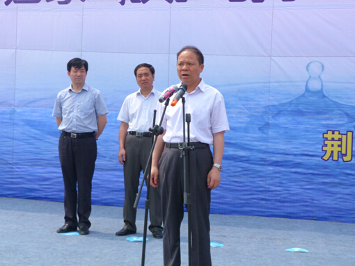 總經(jīng)理陳衛(wèi)國(中)和屈家?guī)X管理區(qū)工委書記湯旺林(右二)、工委主任鄭斌(左一)、市水務局局長曾云(右一)商談施工事宜。 ![]() 市委書記萬勇宣布工程開工