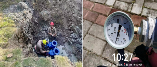 迎春大道臨時加壓設(shè)施3天半完工,天樂小區(qū)水壓從0.08MPa恢復(fù)到0.23MPa。