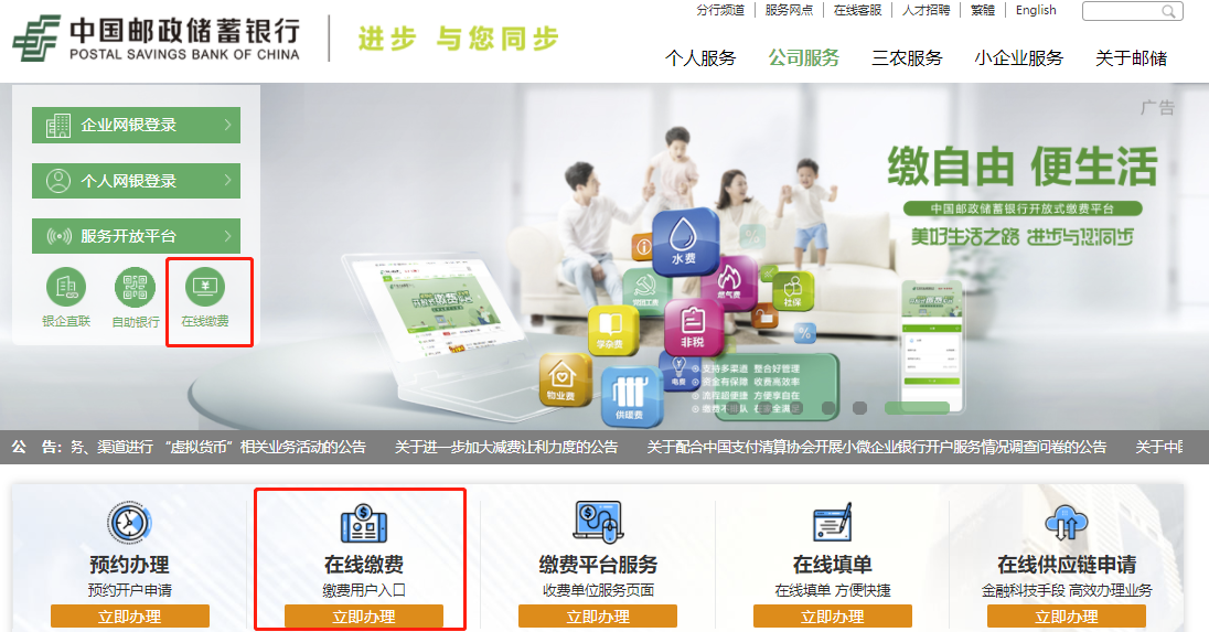 登錄繳費(fèi)用戶登錄“中國郵政儲蓄銀行”官網(wǎng)(http://www.psbc.com/cn/),點(diǎn)擊“服務(wù)快捷通道-在線繳費(fèi)”進(jìn)入,無需注冊及登錄。