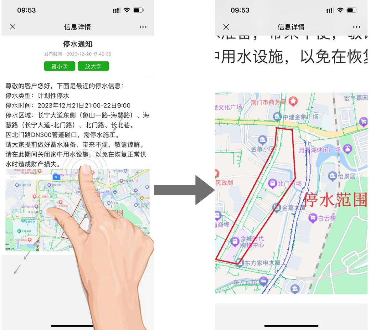 最新停水通知發(fā)出后,用戶通過【查看詳情】,點擊綠色【放大字】按鈕,可清晰查看停水類型、停水時間和停水區(qū)域。