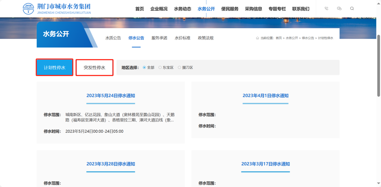 查看“計劃性停水”、“突發(fā)性停水”信息,值得一提的是,通過“地區(qū)選擇”查找會更方便哦!