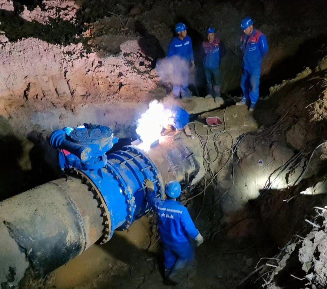 4月9日7時至次日凌晨4時,40余名工作人員陸續(xù)就位,充分調(diào)配備用原水,關閉總閘、排水、抽水、切割、焊接,施工過程一氣呵成。