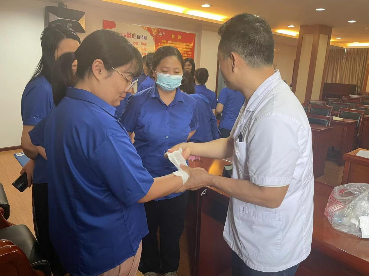 黃主任結合集團實際,講解了燒傷急救、毒蛇咬傷、狂犬咬傷等外傷急救基本技術,并現(xiàn)場示范包扎止血的方法,以及轉運受傷病人的注意事項。