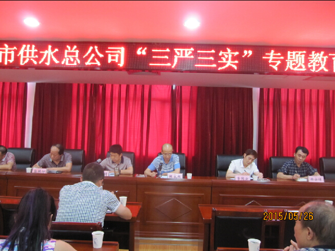5月26日下午,市供水總公司在六樓會(huì)議室召開三嚴(yán)三實(shí)專題教育活動(dòng)動(dòng)員會(huì),黨委書記、總經(jīng)理陳永根聯(lián)系公司實(shí)際為全體黨員上黨課。公司全體黨員、中層以上干部100余人參加,會(huì)議由黨委副書記、紀(jì)委書記、工會(huì)主席徐黎明主持。