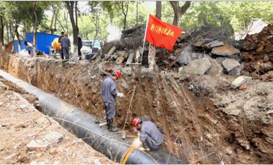 五月,象山大道、三條高速公路出入口道路綜合整治工程項(xiàng)目現(xiàn)場(chǎng)一派熱火朝天景象?!肮┧粨絷?duì)”的紅色旗幟在高高飄揚(yáng);頭戴紅色安全帽身穿藍(lán)色工作服的供水施工人員在緊張施工;挖機(jī)、吊車、發(fā)電機(jī)等大小機(jī)械設(shè)備一致排開(kāi);焊花飛濺、機(jī)聲隆隆、有條不紊、忙而不亂......這就是維修處施工人員奮戰(zhàn)在四條道路上進(jìn)行管道遷改的工作場(chǎng)景。