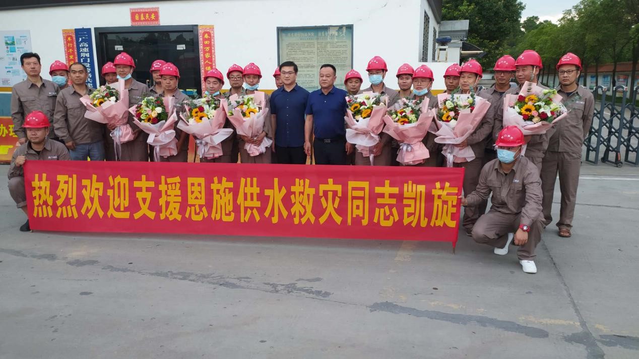 7月27日晚7時,市供水總公司逆行出征恩施市的應(yīng)急供水救援隊全部平安凱旋。公司黨委委員、副總經(jīng)理曾波帶領(lǐng)相關(guān)負(fù)責(zé)人趕往荊門北高速公路出口迎接,獻(xiàn)上鮮花感謝8名隊員勇往直前,不畏艱險,圓滿完成了這次艱巨的供水救援任務(wù)。