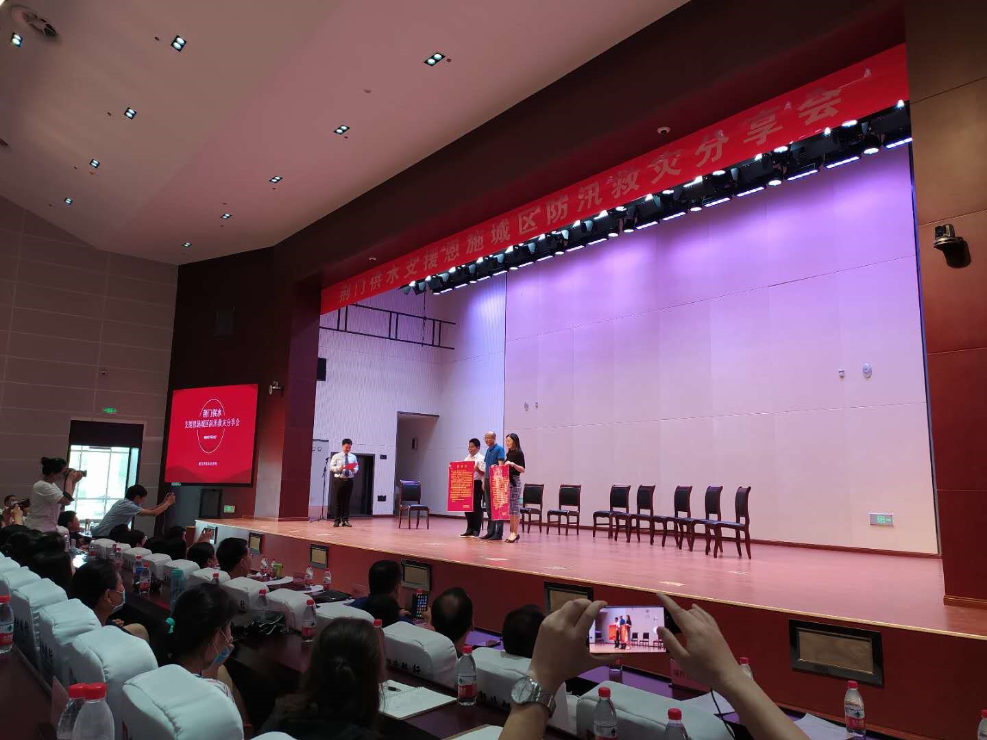 7月31日下午,市供水總公司在荊門劇院舉行支援恩施城區(qū)防汛救災(zāi)分享會,表彰支援恩施城區(qū)防汛救災(zāi)中的先進個人,進一步激發(fā)全員干事創(chuàng)業(yè)工作熱情,營造公司上下創(chuàng)先爭優(yōu)工作氛圍。市城控集團黨委副書記張本華、上海連城集團有限公司荊門辦事處總經(jīng)理吳彬婷、奇力士(武漢)智慧水務(wù)科技有限公司董事長畢濤應(yīng)邀出席會議,公司黨委班子全體成員,中層干部、班組長和機關(guān)全員、年輕職工代表等160余人參加會議。